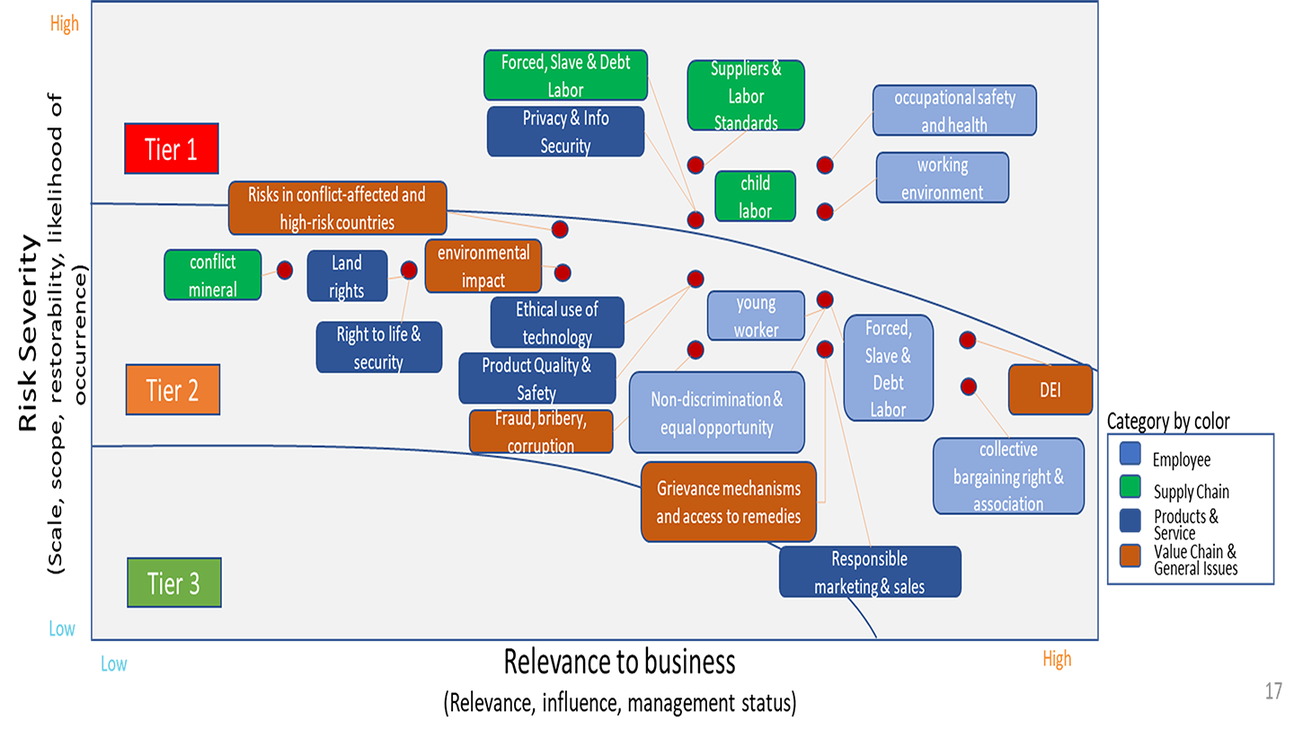The breakdown of the recommendations is as follows: 18 for management systems (including the establishment of a human rights promotion system), 17 for employee rights, 19 for supply chain rights, 16 for product services and human rights, and 16 for other cross-cutting issues (including improvements to the grievance mechanism).